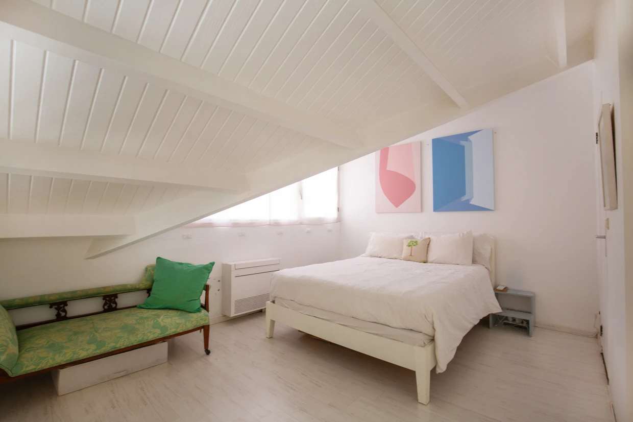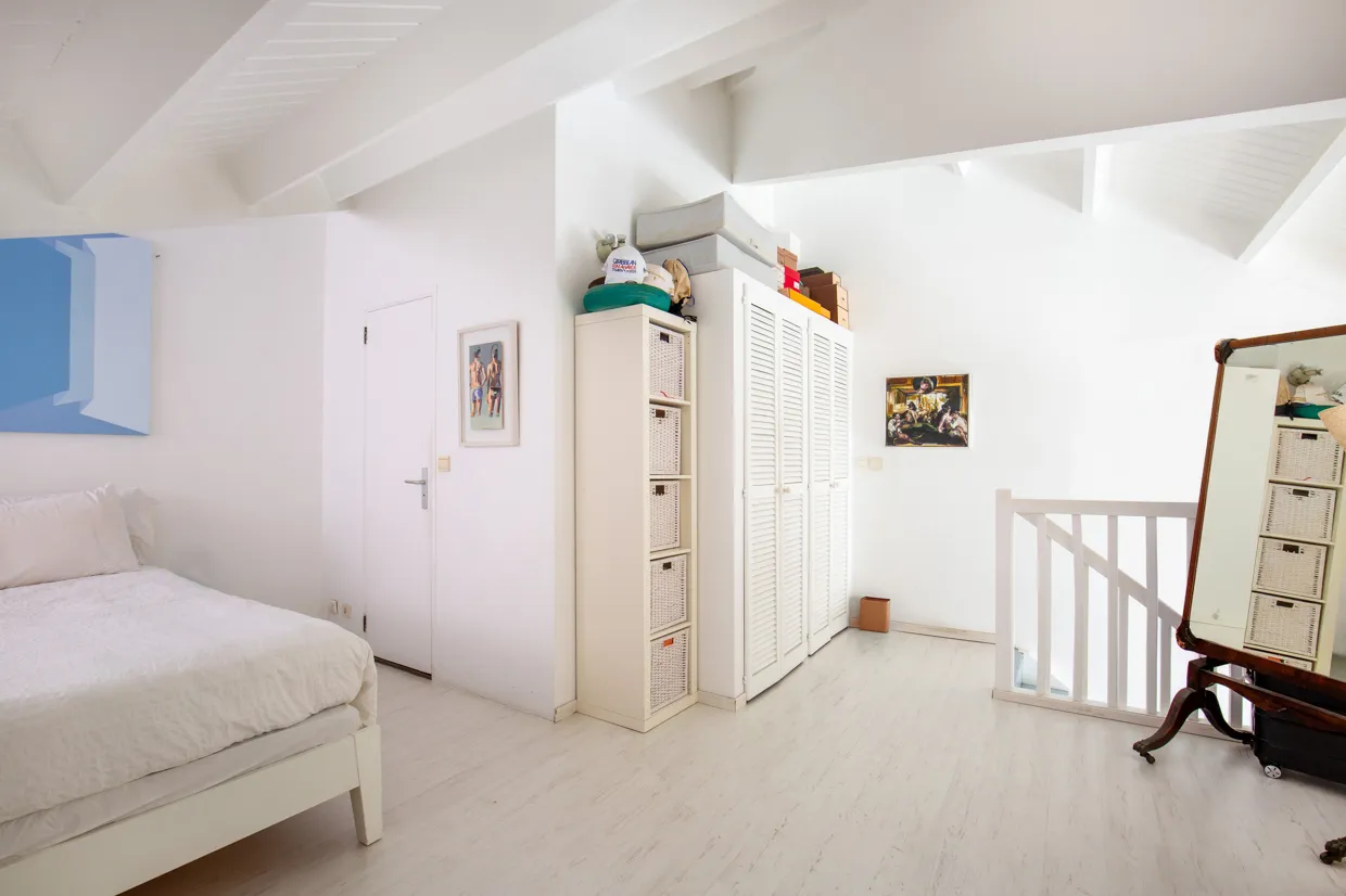 Un escalier mène à la mezzanine, où se trouve une chambre confortable avec sa salle de bains attenante.