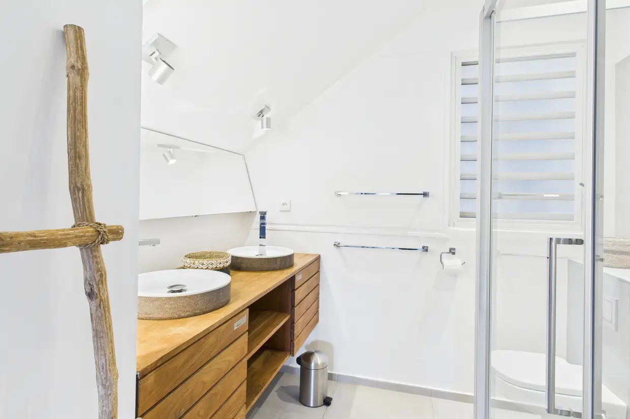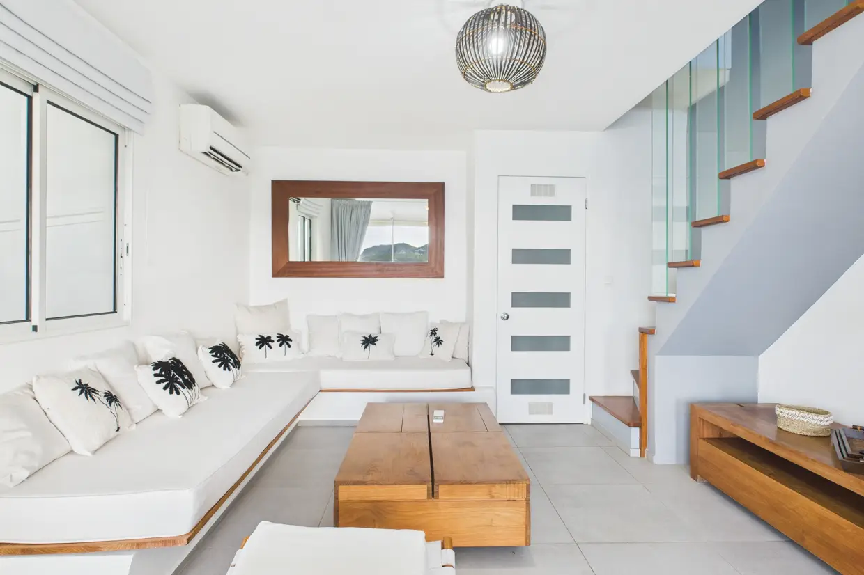 À la fois chaleureux et baigné de lumière naturelle, ce charmant duplex propose un bel espace de vie comprenant un salon avec cuisine équipée, un coin repas et une salle d’eau. La pièce principale s’ouvre sur une terrasse privative dotée d’un jacuzzi, offrant une magnifique vue sur la baie de Saint-Jean ; un cadre idéal pour se détendre et profiter de la douceur de vivre de l’île. Un escalier mène à l’étage, où se trouve une chambre confortable avec sa salle de bains attenante, offrant intimité et sérénité.