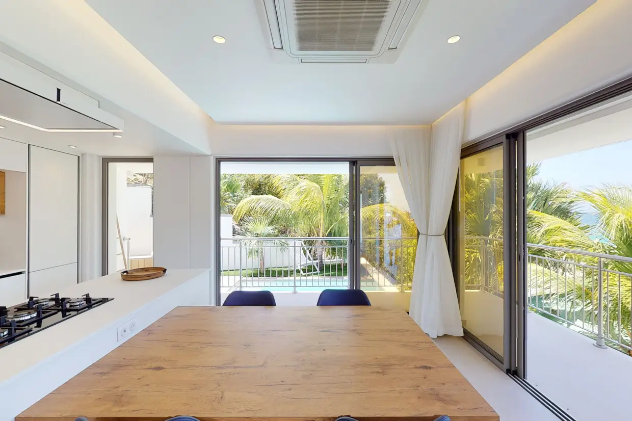 Chaque appartement est identique et propose les mêmes prestations. Ils s’organisent autour d’un séjour climatisé réunissant un espace salon et une cuisine américaine équipée, avec une vue dégagée sur la mer et l’îlet Bonhomme. Les espaces de vie se prolongent sur des terrasses, dont une couverte et une avec piscine, face à la baie de Flamands.