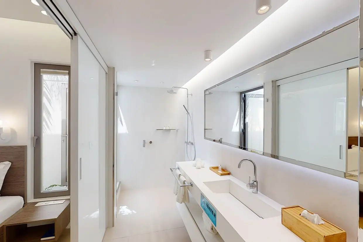 L’appartement comprend deux chambres, chacune avec sa salle de bains, dans un style épuré.