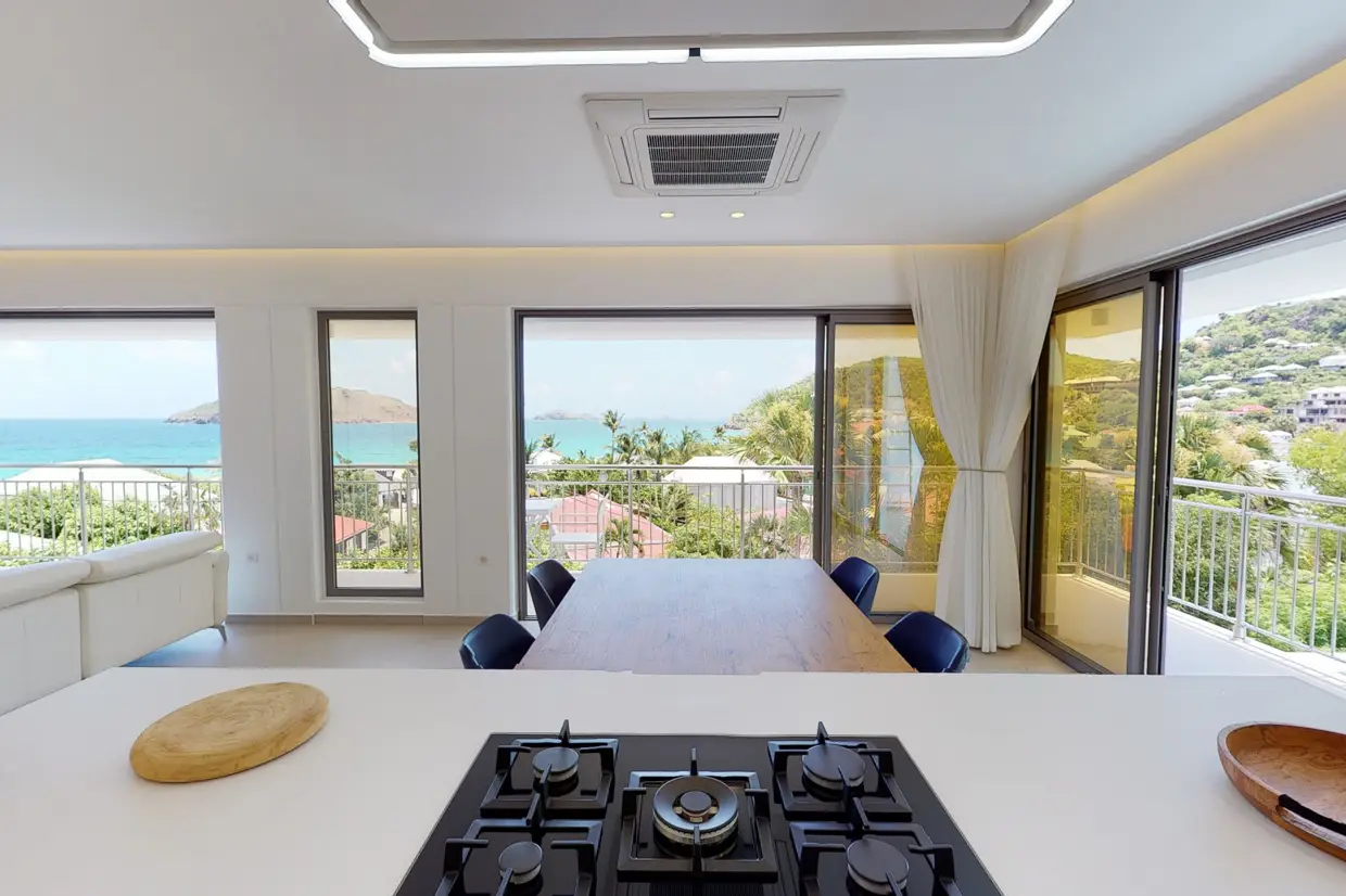 Ce bien propose un espace de vie lumineux et climatisé, composé d’un séjour avec un espace salon, une cuisine ouverte équipée et un espace repas. L’ensemble profite d’une belle perspective sur la mer et l’îlet Bonhomme.