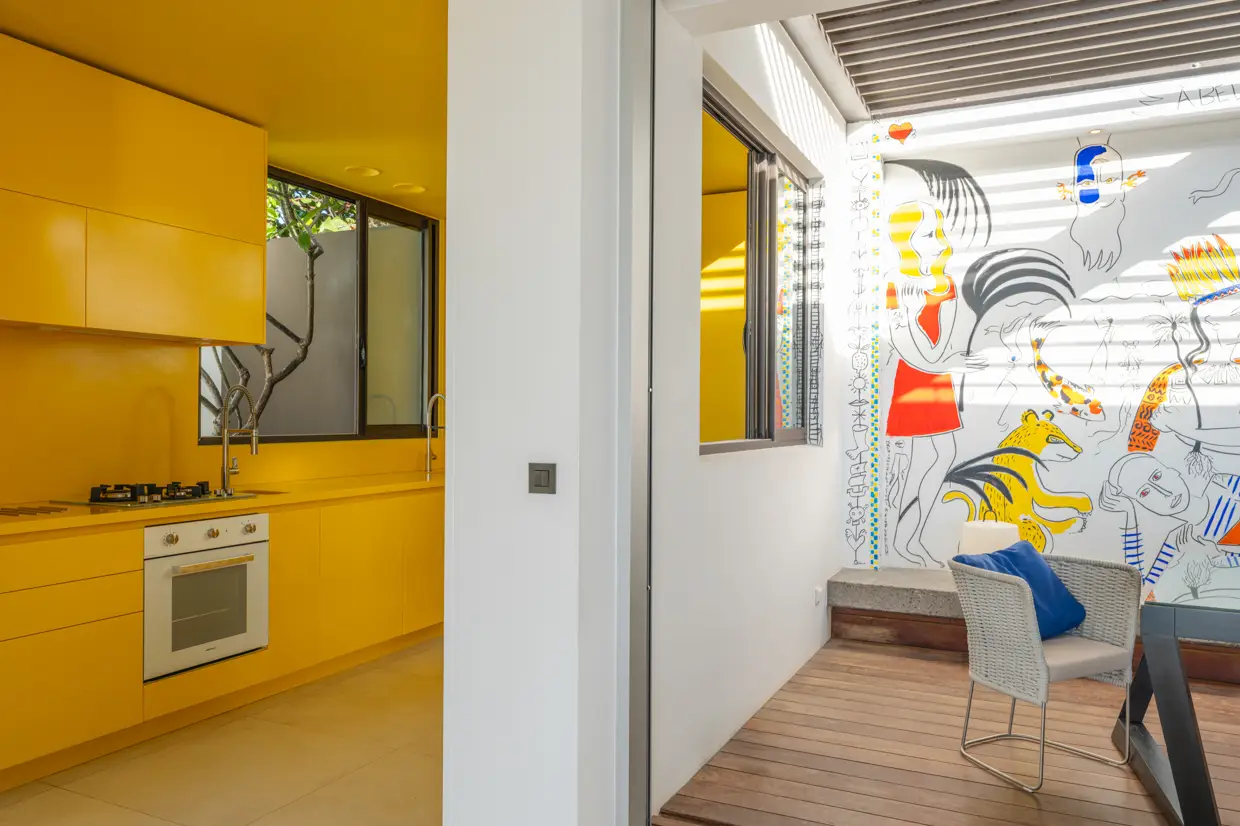 À l’intérieur, le décorateur Duan Zhang de Courrèges a su sublimer les volumes généreux par des boiseries sur mesure qui renforcent le raffinement de la villa. Le mobilier haut de gamme dialogue avec les pièces de créateurs. Dans le séjour, une fresque colorée réalisée par l’artiste Jean-Charles de Castelbajac vient sublimer le patio extérieur et protégé des éléments, insufflant une énergie pop à vos repas qui contraste avec la douceur apaisante du paysage.