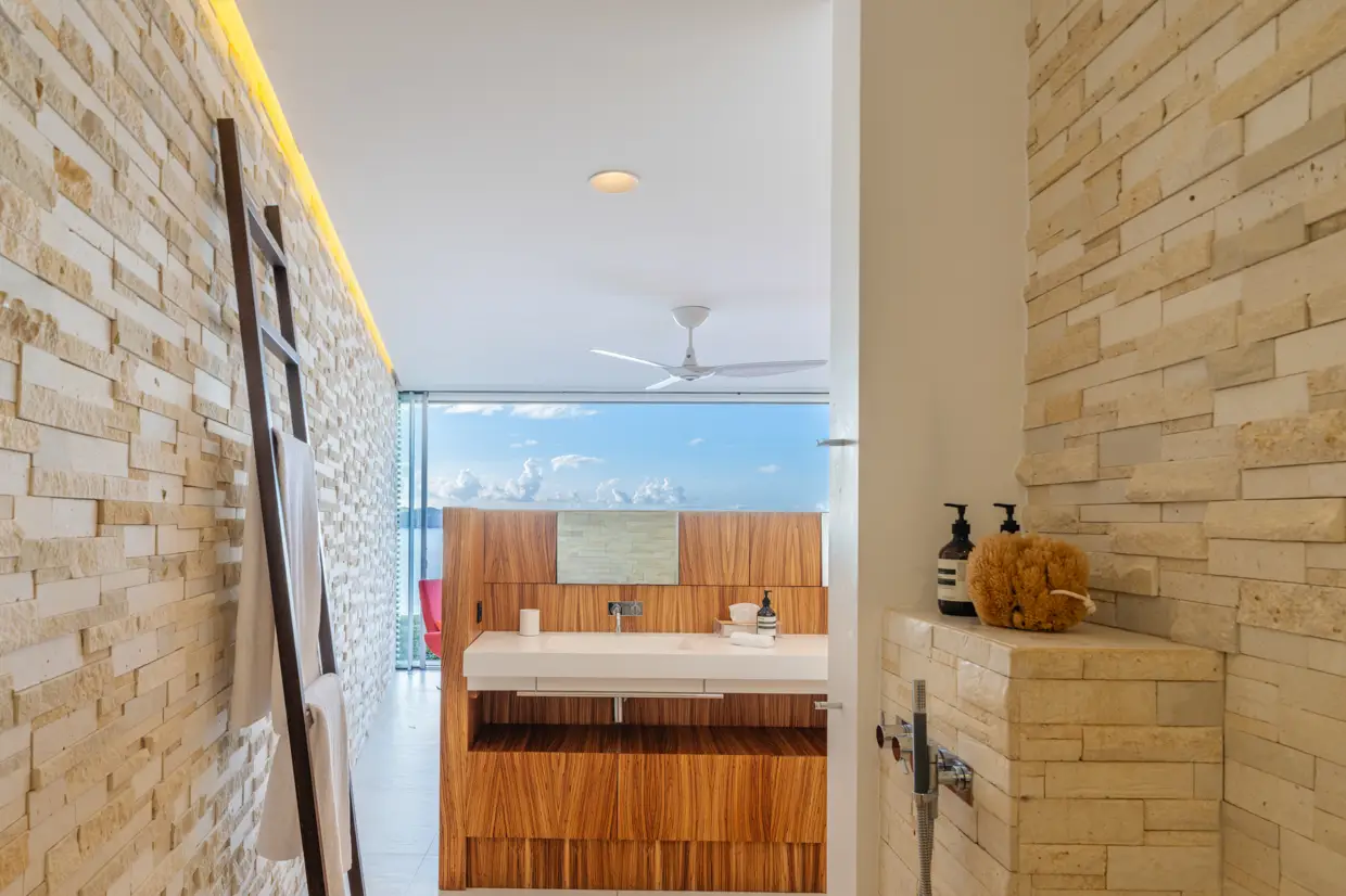 La villa dispose d’une cuisine entièrement équipée et habillée d’une teinte solaire, d’un séjour climatisé si souhaité, d’un bureau discret, ainsi que d’une vaste suite parentale avec dressing et salle de bains privative. Chaque espace profite d’ouvertures généreuses sur la mer, offrant une immersion dans la nature qui s’offre à vous.