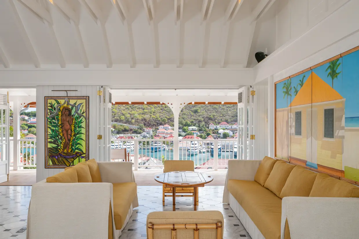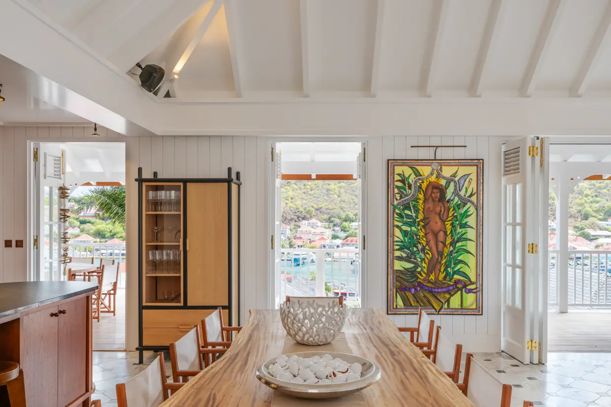 Dès que l’on franchit l’entrée, un vaste séjour lumineux se dévoile, regroupant salon, espace repas et cuisine ouverte. Les tons clairs, les matières naturelles et les éléments de décoration inspirés par les couleurs de l’île créent une atmosphère élégante et chaleureuse. De grandes ouvertures menant à une terrasse couverte dévoilent une vue imprenable sur le port, où yachts et bateaux de plaisance reposent à l’amarrage.
