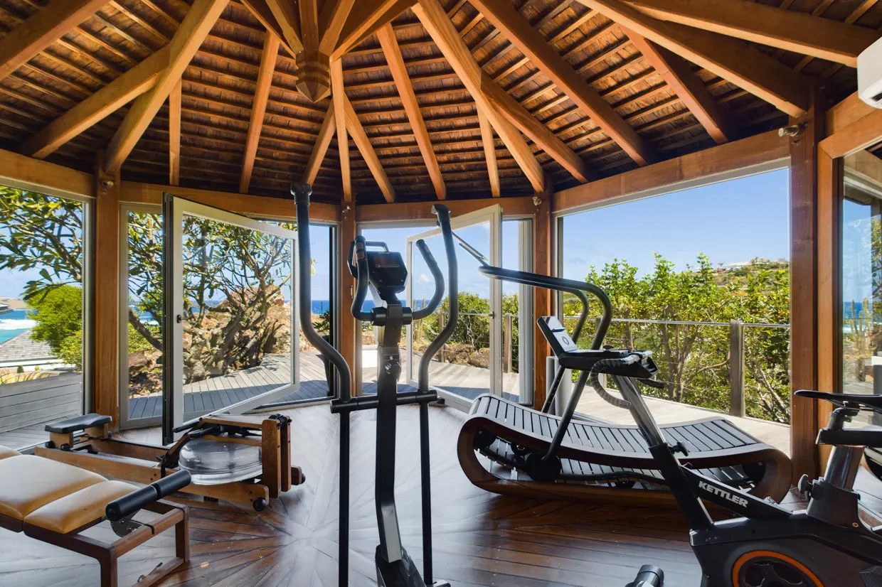 Les sportifs apprécieront la salle de fitness entièrement équipée située dans un gazebo vitré ayant une sublime vue sur la mer, ainsi que les courts de tennis exclusifs du Domaine du Levant et situés au pied de la villa.
