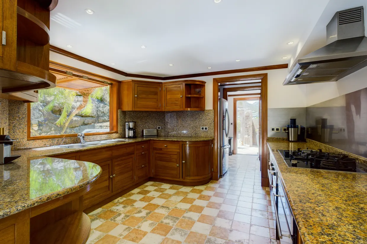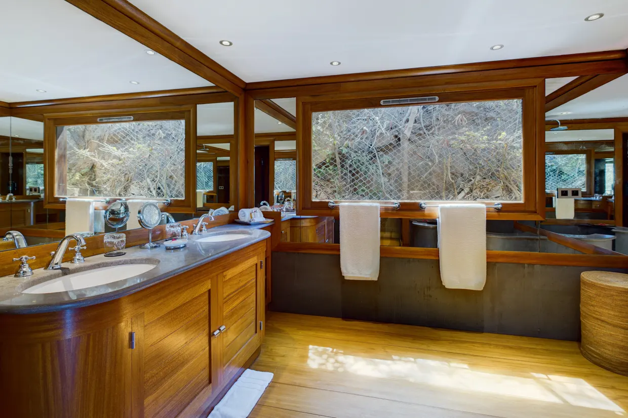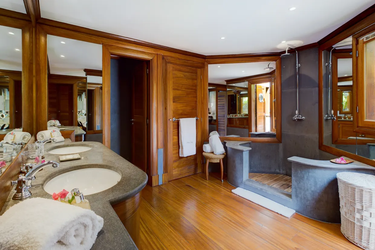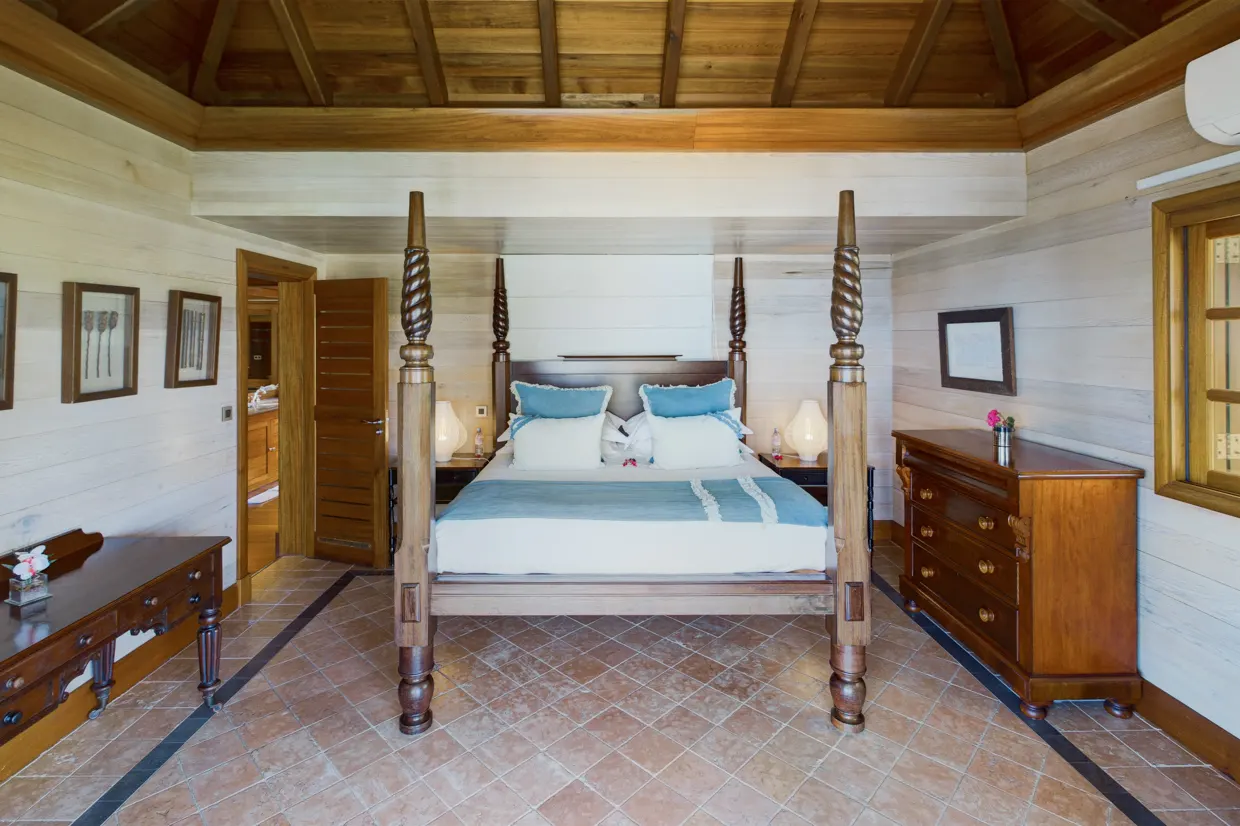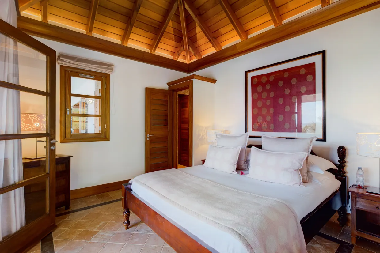 Côté nuit, les cinq chambres sont réparties sur trois niveaux, toutes climatisées et disposant d’une salle de bains privative et d’une belle vue sur l’océan. Leur décor boisé vous transportera dans un voyage authentique mariant l’ancien au luxe et au confort. Au niveau inférieur se trouvent deux chambres similaires qui partagent une terrasse et un jacuzzi pour de délicieux moments de détente face à un panorama à couper le souffle. Trois autres chambres dont l’ambiance est chaleureuse sont perchées sur la colline.