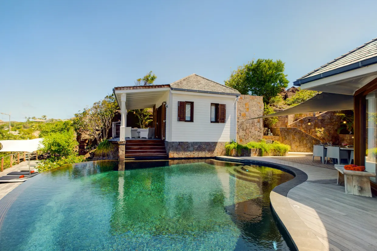 Indian Song est un véritable bijou architectural alliant avec élégance luxe, esthétique et raffinement, et construite avec des matériaux nobles tels que la pierre et le bois. Elle est composée de pavillons disposés sur plusieurs niveaux, chacun offrant une vue splendide sur les eaux cristallines du lagon. Le pavillon principal est composé de la cuisine entièrement équipée, avec comptoirs en granit, et d’un grand salon contemporain s’ouvrant sur la terrasse partiellement couverte abritant la salle à manger extérieure et donnant sur la piscine chauffée à débordement en forme de demi-lune, propice à la poésie et à la relaxation. Une salle de télévision avec un bureau séparé est également située à proximité, un havre de paix offrant l’assurance d’un dépaysement total.