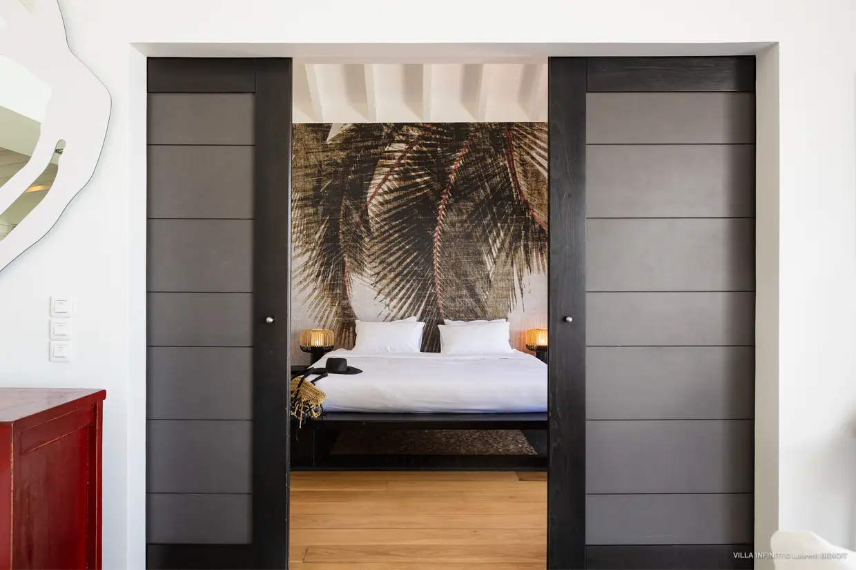 La partie nuit comprend deux chambres avec salle de bains privative, situées de part et d’autre du séjour. En contrebas, une troisième chambre plus intimiste s’ouvre sur une terrasse privative.