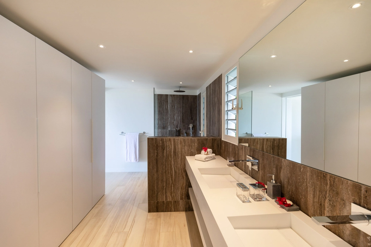 Depuis le salon, un passage fluide mène à la cuisine américaine équipée, ainsi qu’à une seconde salle à manger couverte. Ces espaces sont reliés à la terrasse, créant une circulation naturelle et harmonieuse entre l’intérieur et l’extérieur. Sur les côtés, on découvre les deux premières des quatre suites que totalise la villa. Toutes comprennent un lit king-size, une salle d’eau spacieuse avec double lavabo et une terrasse sur le devant.