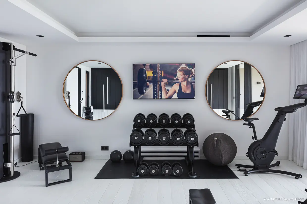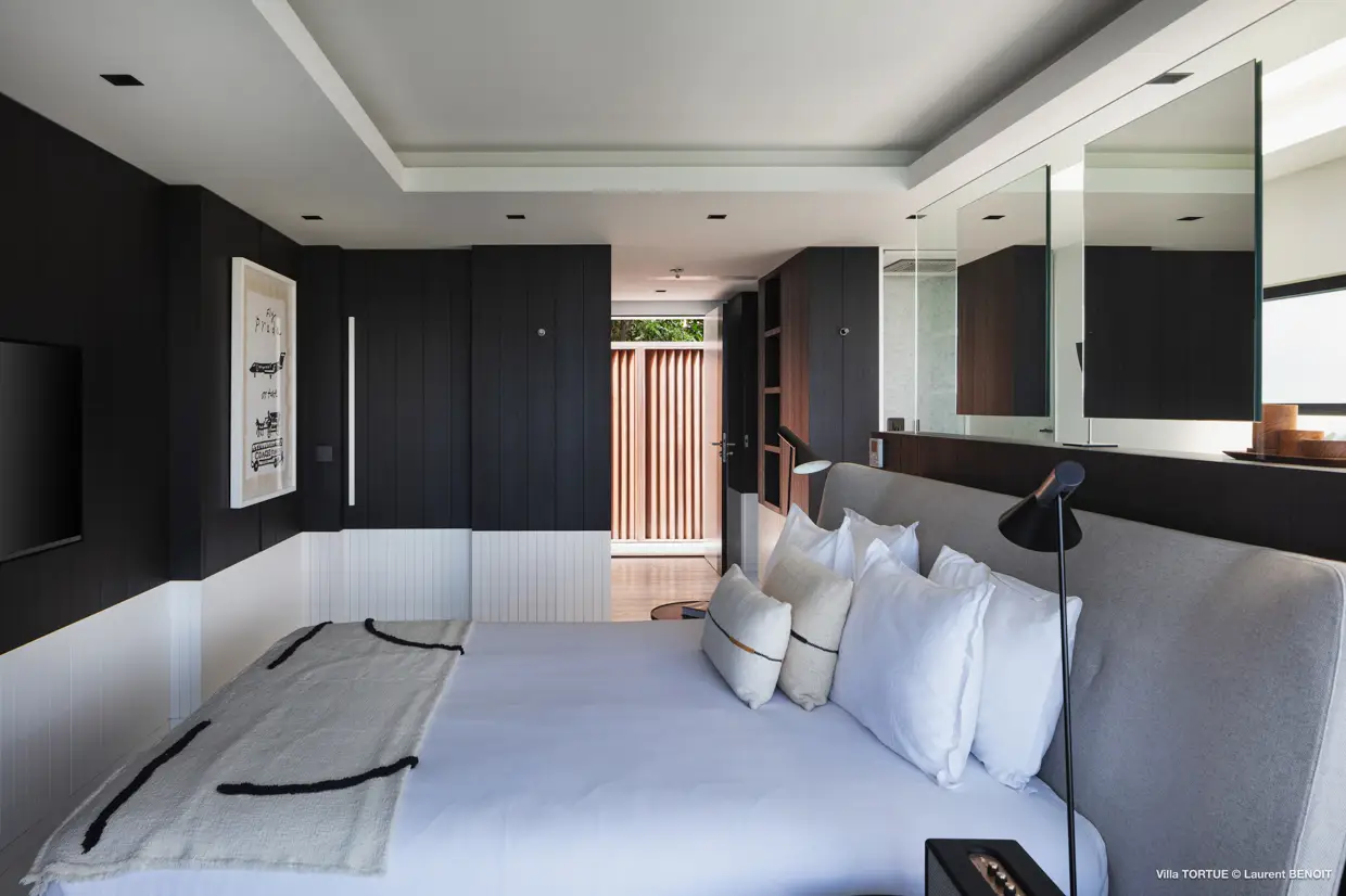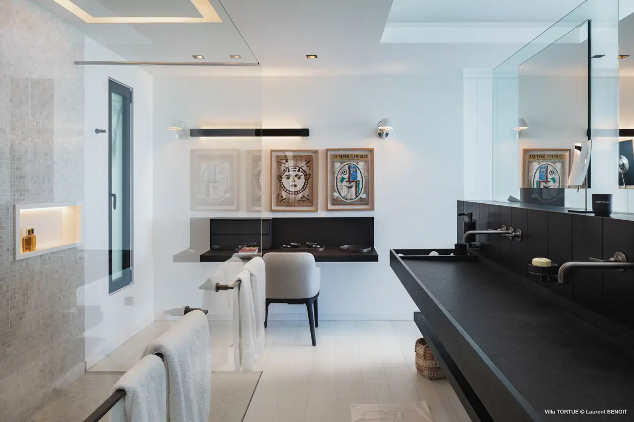 À l’étage supérieur, la suite principale et sa terrasse privative sont orientées face à la baie. Un peu plus bas, sont disposées deux autres suites. L’une d’elles est actuellement convertie en salle de sport et dispose d’une belle terrasse.