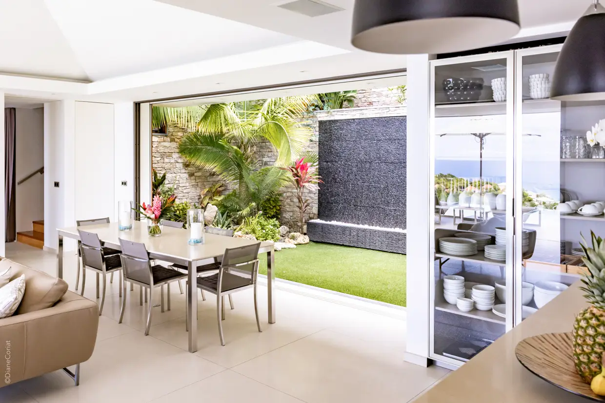 De larges baies vitrées effacent les frontières entre intérieur et extérieur et s’ouvrent sur la terrasse faisant face à l’immensité de la mer et le paysage environnant. La piscine à débordement chauffée invite à des moments de détente absolue, tandis qu’un ajoupa abrite un salon extérieur, parfait pour profiter de la douceur des nuits tropicales.