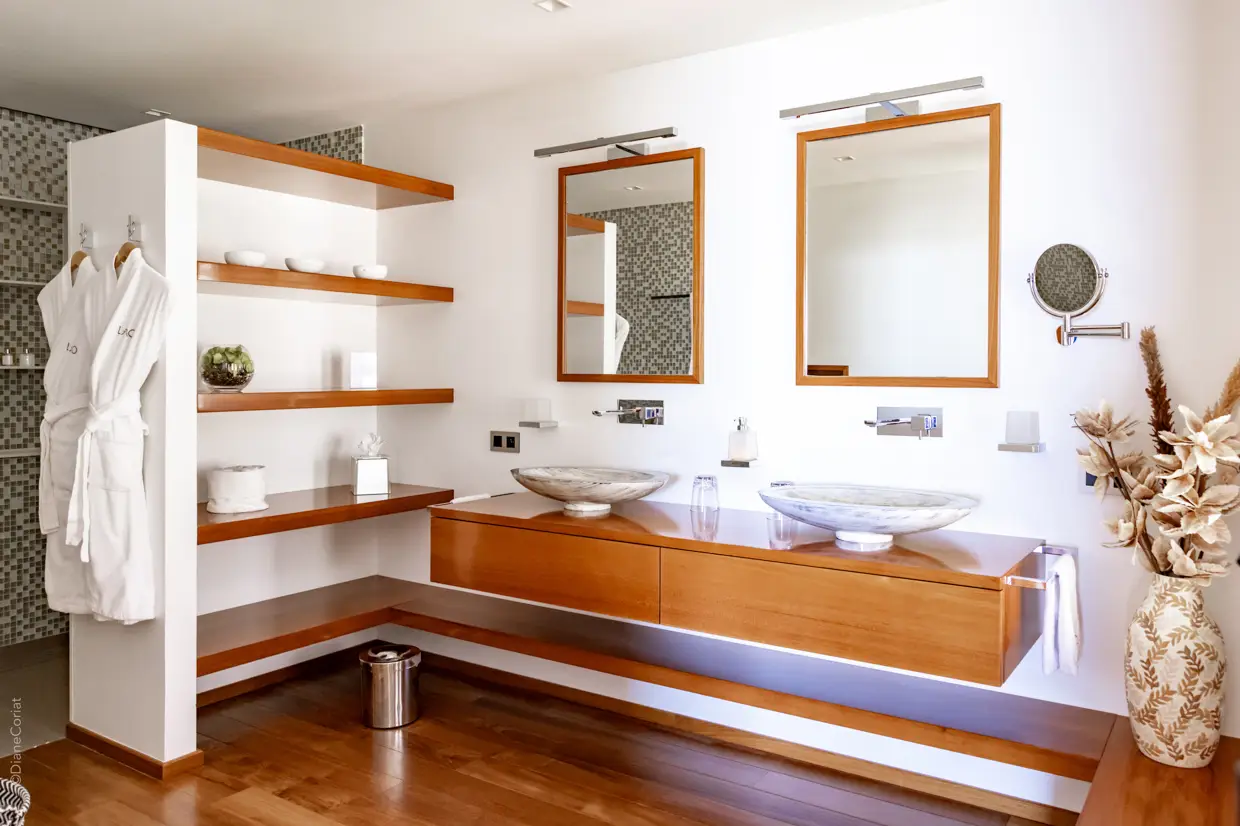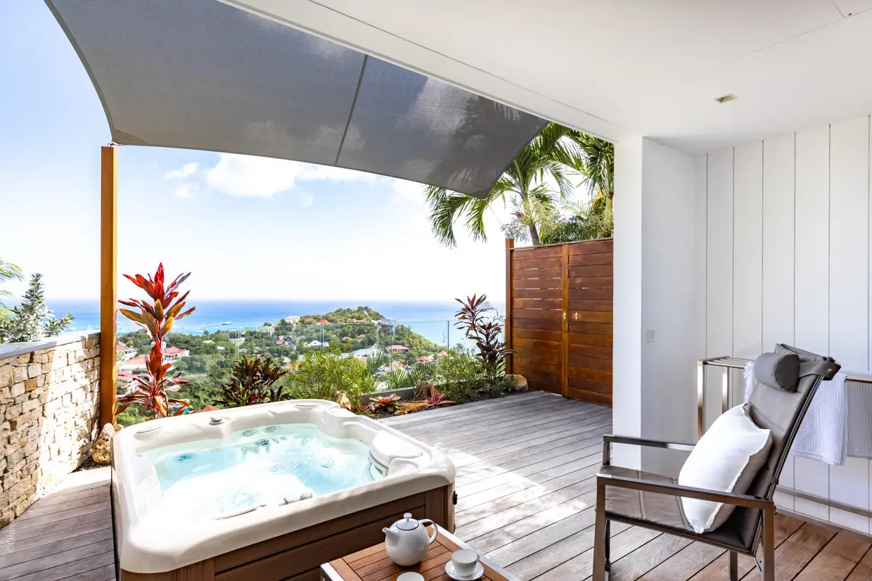La partie nuit se compose de trois chambres réparties sur différents niveaux offrant un véritable cocon de tranquillité. Chacune dispose de sa propre terrasse privative avec jacuzzi, un espace privilégié pour profiter du panorama idyllique en toute intimité.
